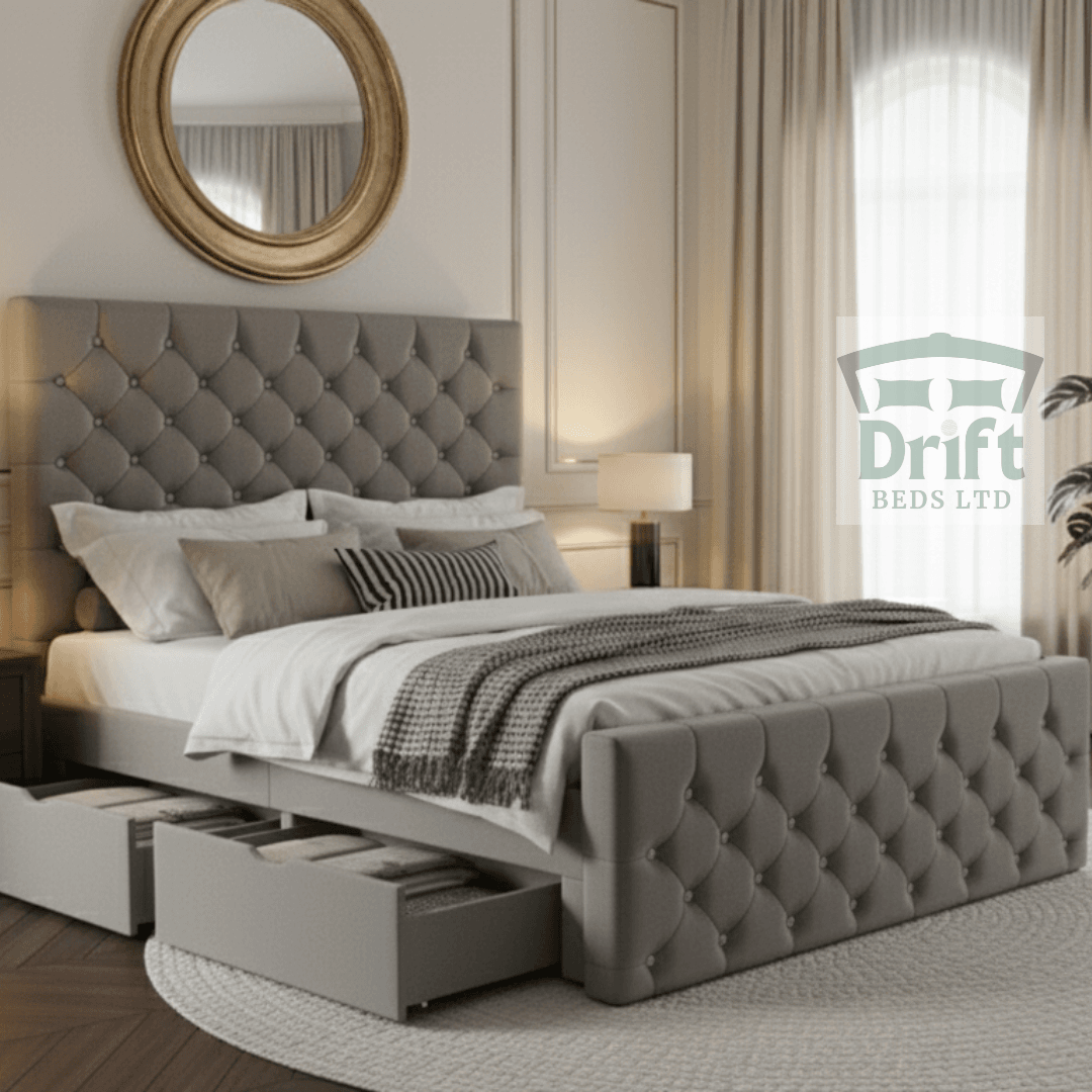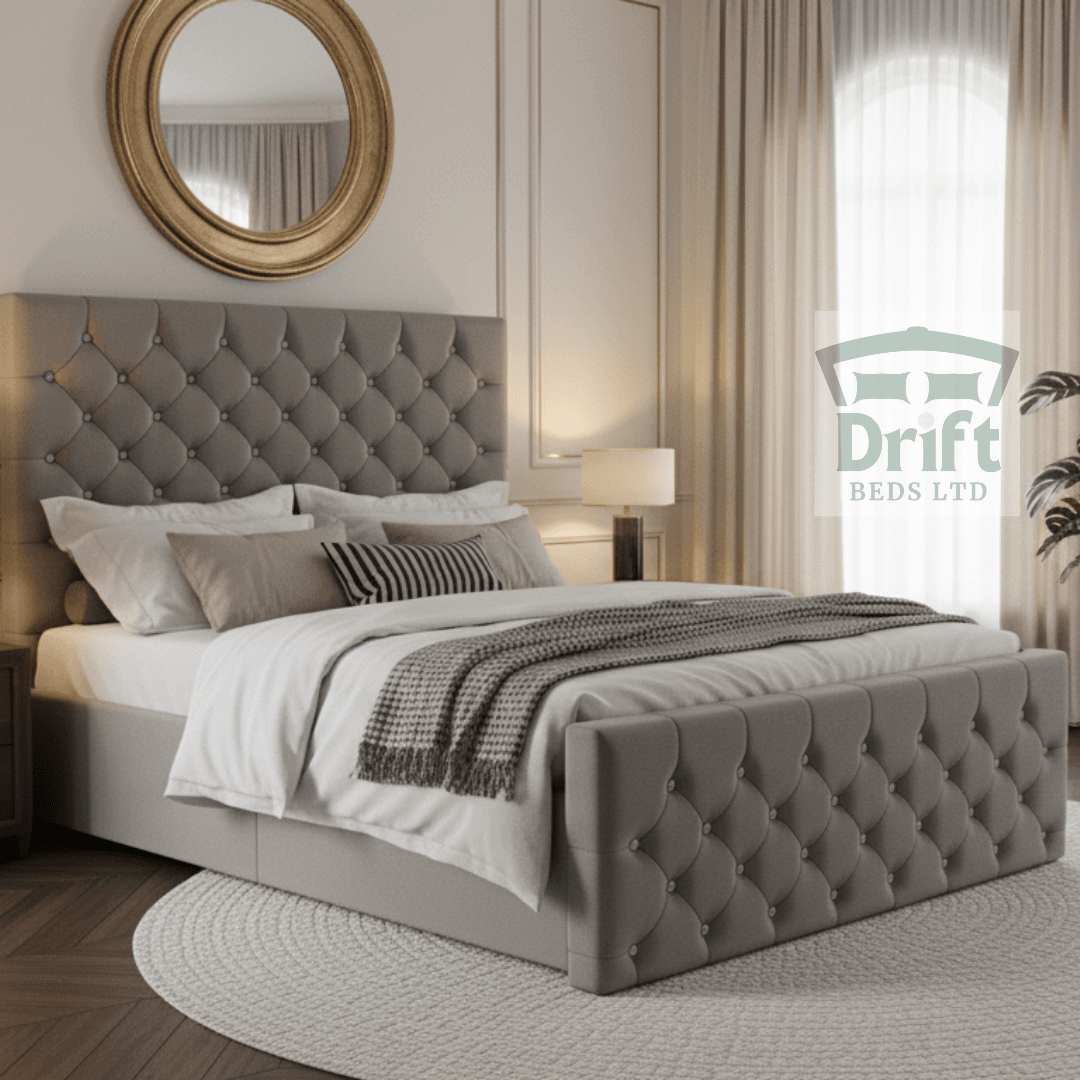 At Drift Beds, we honour classic designs with exceptional quality. The Chesterfield bed is built upon a foundation of a robust, solid wood frame. The intricate button-tufting is a testament to the skill of our UK-based artisans, who ensure every detail is perfect. Upholstered in premium, hard-wearing velvets, this bed is designed to be both a joy to look at and a durable investment for your home.